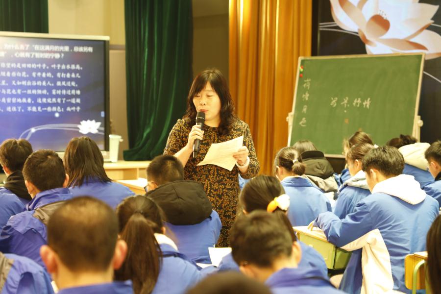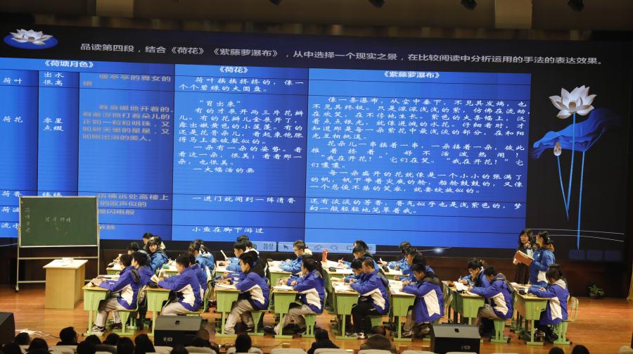 课后,四川省教育科学研究院学术委员会副主任,高中语文教研员段增勇老师进行了点评。段老师认为,李老师选择“寻找最美的风景”为议题,将小学的《荷花》、初中的《紫藤萝瀑布》、高中的《荷塘月色》组成群文聚落,引领学生进行联结整合,寻共性品细节,比同析异,以旧解新,以点带面,找到写景抒情的切入点、思考点,落实语文核心素养“语言、思维、审美、文化”生成的重要焦点。在阅读的求同求异的思考探究中,常读常新,催生学生的高阶思维,逐步拓展阅读视野,提高综合能力。这组群文阅读教学设计完成了由集美到积淀“荷花”在中国传统文化中独特的意义的升华。
