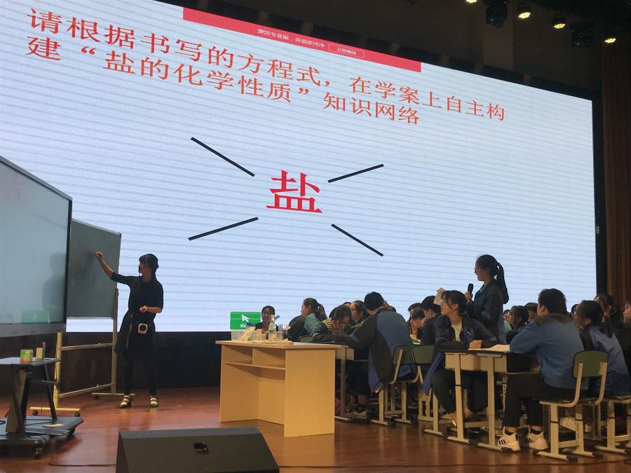 首先,由双流中学实验学校的龚芮琦老师以《盐的复习》这一课题内容进行现场课例展示。龚老师以生活中常见的物质分类引导学生回忆盐的结构特征,复习常见盐的基本用途,根据常见盐的反应来让学生构建知识网络,复习复分解反应以及酸碱盐的综合应用。复习了常见盐氯化钠、碳酸钠、碳酸氢钠和碳酸钙的性质和用途;复分解反应的特征和发生条件;以及反应后溶液中溶质成分探究问题。在本节课的教学设计中,体现了教-学-评一致性,加强了学生知识过手,提高复习效率。