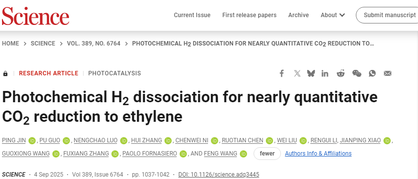 这篇论文由大连化物所研究员王峰团队联合意大利的里雅斯特大学教授paolo fornasiero等合作完成,于北京时间9月5日成功登上《科学》杂志。他们发展了一种新型光催化策略,实现了常温氢气异裂。该研究将氢气的新方式用于二氧化碳还原,直接制备了乙烷、乙烯等高附加值化学品。相较于传统高温高压加氢工艺,这一新方法有望大幅降低能耗,并有效减少二氧化碳排放,为碳资源的高效优化利用提供新路径。