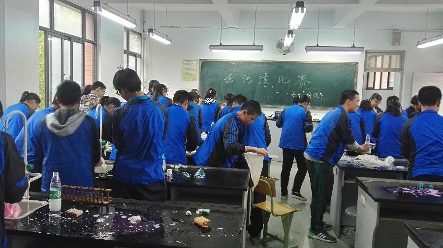 由双流中学实验学校化学组承办的本届去污渍比赛在4月10号下午火热进行。同学报名积极,参加本次大赛的同学共计18个,小组52人。本次比赛中,同学们做了充分的赛前准备,去污渍的药品各式各样,如肥皂、洗衣粉、洗衣液、漂白剂、柠檬、双氧水等。比赛中,更是通力合作,各司其职。通过二十多分钟的清洗,个小组将三张分别被油污、墨水和品红污染了的棉布洗的干干净净。