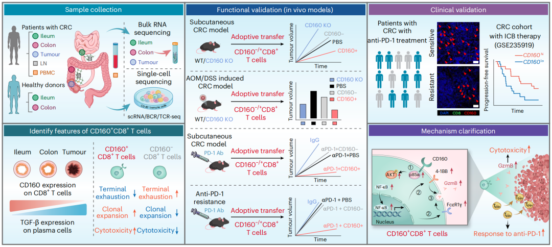该研究发现了回肠中特异性富集的 cd160⁺ cd8⁺ t 细胞,并揭示了其此前未被认知的特性,cd160 通过调控结直肠癌中 cd8⁺ t 细胞的耗竭,提高抗 pd-1 免疫疗法的效果并克服其耐药性。
