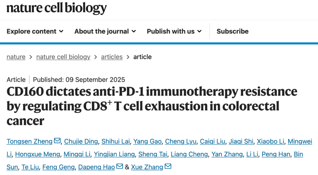 2025 年 9 月 9 日,哈尔滨医科大学张学院士、郝大鹏教授、哈尔滨医科大学附属肿瘤医院郑桐森教授等在 nature 子刊 nature cell biology 上发表了题为:cd160 dictates anti-pd-1 immunotherapy resistance by regulating cd8 t cell exhaustion in colorectal cancer 的研究论文。