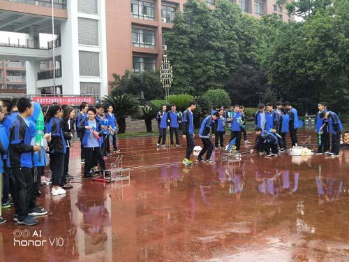 下午,物理老师们早早地来到运动场,放置好水火箭发射架,准备好打气筒,用警戒线拉出了安全区域,做好了各项相关准备工作。参赛同学们带着他们精心制作的五十多只精品 “水火箭”,迫不及待地聚集到了运动场。