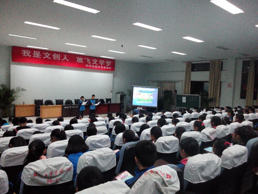 2014年11月30日晚,我校文创班“我是文创人,放飞文学梦”迎新主题会在学术厅举行。七、八年级文创班所有同学齐聚一堂,偌大的学术厅座无虚席。文创班班主任、文创特色班走出的中国新一代创作新星——万亿、省青少年作协双流分会秘书长等出席了此次活动。