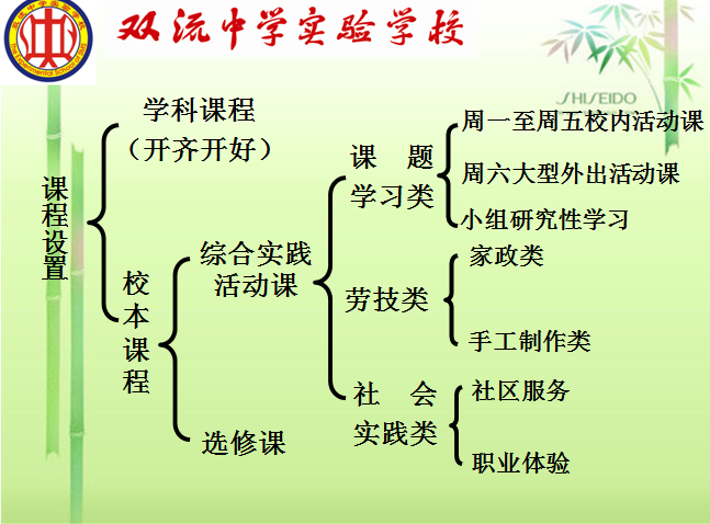 校本课程是学校课程设置的最大特特色。校本课程大体可以分为综合实践活动课、选修课以及德育课程三大类,综合实践活动课又分为课题学习类、劳技类和社会实践三种。课题学习类包括周一至周五校内活动课、周六大型外出活动课以及有更高研究需求的小组研究性学习。这些课题的开展有利于培养学生的创新意识和综合实践能力,对孩子的一生都会有良好的引导作用。