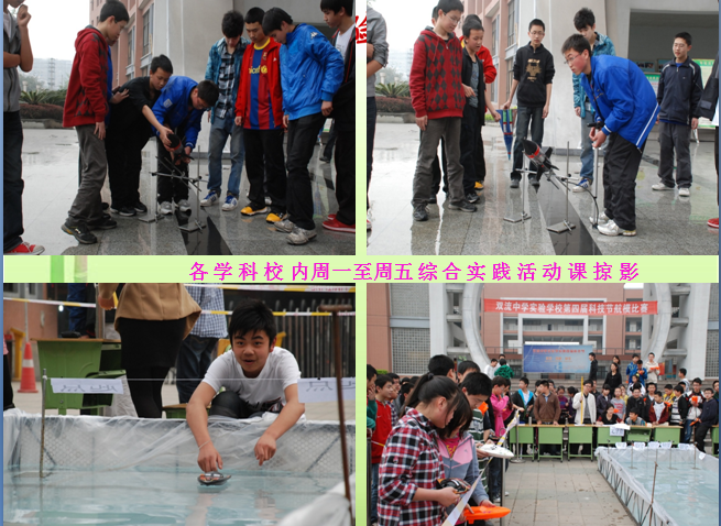 周一至周五的校内活动课:学生在校期间,在完成教学任务之余,每个学科老师都会拿出课堂的部分时间让学生进行拓展探究,如物理组的水火箭、鸡蛋撞地球;历史组的成语故事、端午探源;政治组的辩论赛、生物组的实验操作大赛,数学组的趣味数学等。这些活动是书本知识的一个延伸,既调动学生学习的积极性,又培养了学生的探究能力,非常受学生的欢迎。也许多年以后,学生已淡忘了某一个知识点,但是对曾开展的某一个活动一定会记忆犹新。