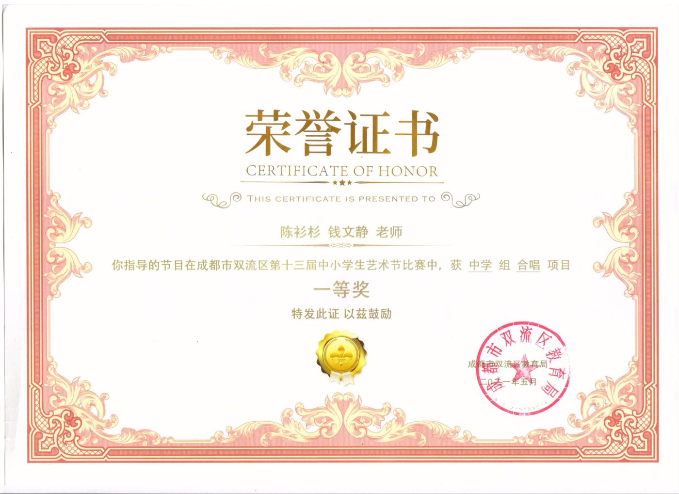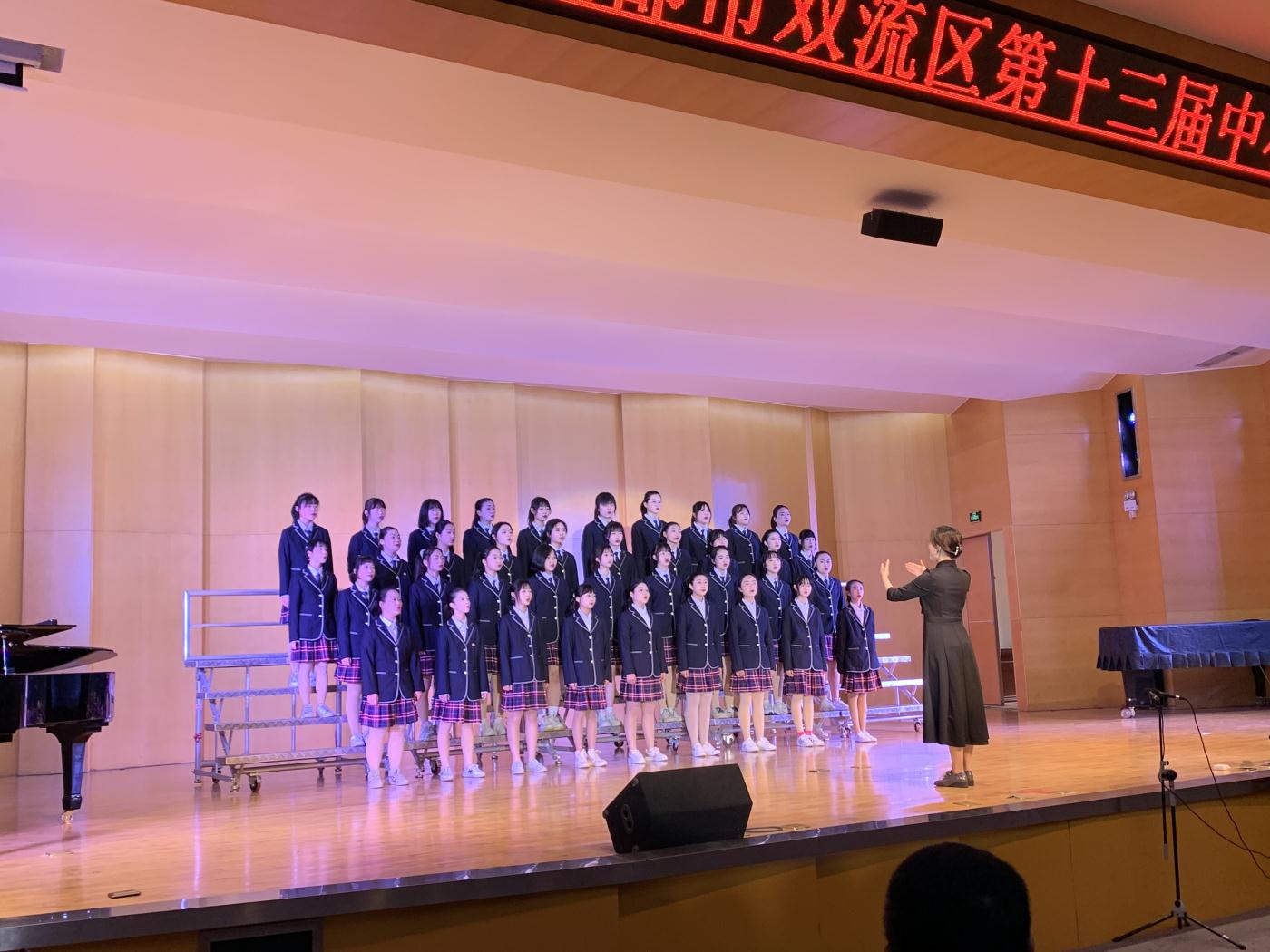 经过刻苦练习,由钱文静、陈衫杉老师指导的我校学生合唱团 在双流区中小学生艺术节中学组合唱比赛中