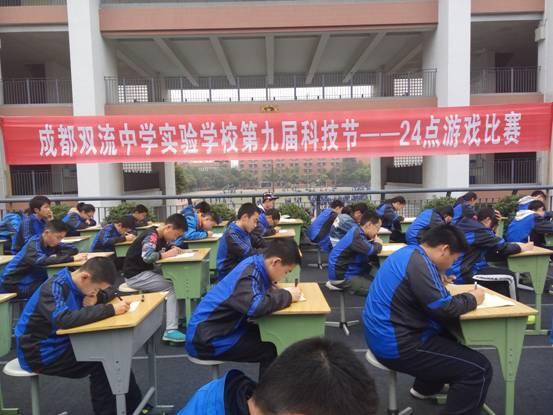 2016年3月28日(星期一)下午,双流中学实验学校第九届科技节—24点游戏比赛决赛在图书馆顶楼顺利进行。全校七年级师生通过近三周的准备,经各班初赛,评选出80名学生参加决赛。 赛场上每位选手都希望能取得好成绩,为班级争光,赢得荣誉,个个都使出浑身解数,联系平时学到的各种相关知识,认真的推算着游戏结果。最后评委按照答题得分高低评选出55位优胜者。
