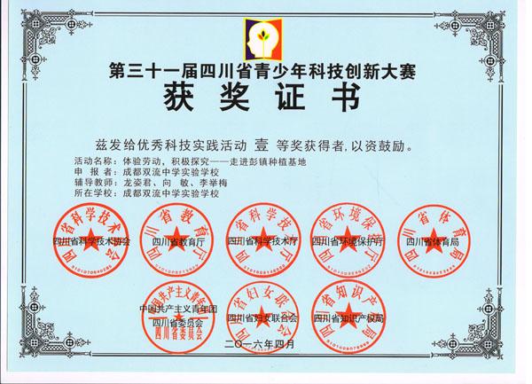 2016年4月,在石室天府中学举办的第三十一届四川省青少年科技创新大赛中,我校龙姿君、向敏和李举梅三位老师辅导的科技实践活动 《体验劳动,积极探究——走进彭镇种植基地》荣获优秀科技实践活动省一等奖。现已被推荐并申报第三十一届全国青少年科技创新大赛。
